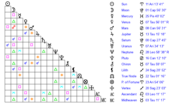 Moon | 1 Capricorn 45 | 24 Taurus 10 | 8 Cancer 4 |