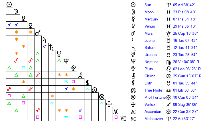 | Moon | 23 Pisces 0 | 28 Aquarius 29 | 19 Aries 37 |