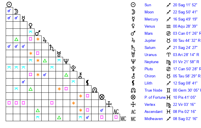 | Moon | 22 Sagittarius 52 | 11 Taurus 43 | 29 Gemini 17 |