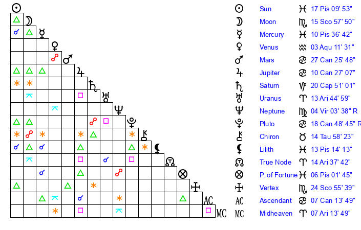 | Moon | 15 Scorpio 53 | 13 Cancer 43 | 15 Aries 22 |