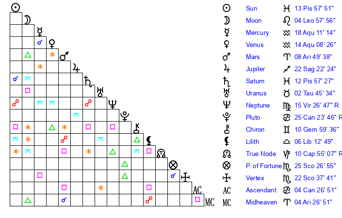| Sun | 13 Pisces 57 | 14 Pisces 22 | 10 Gemini 59 |