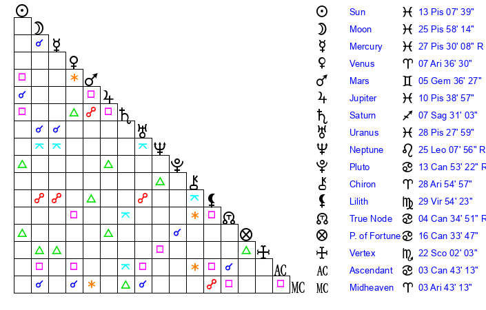 | Pluto | 13 Cancer 54 | 2 Aquarius 59 | 14 Cancer 46 |
