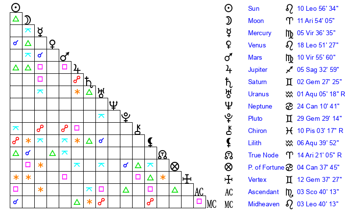 Moon | 11 Aries 50 | 5 Sagittarius 27 | 2 Gemini 27 |
