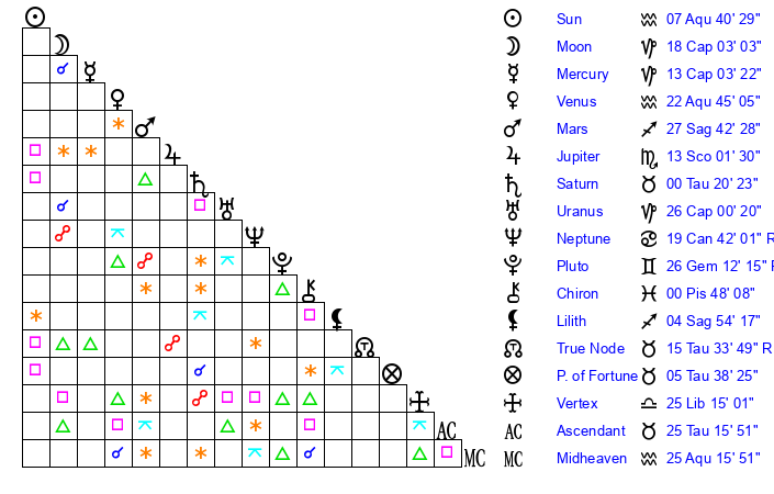 Sun | 7 Aquarius 41 | 9 Aquarius 2 | 0 Gemini 28 |