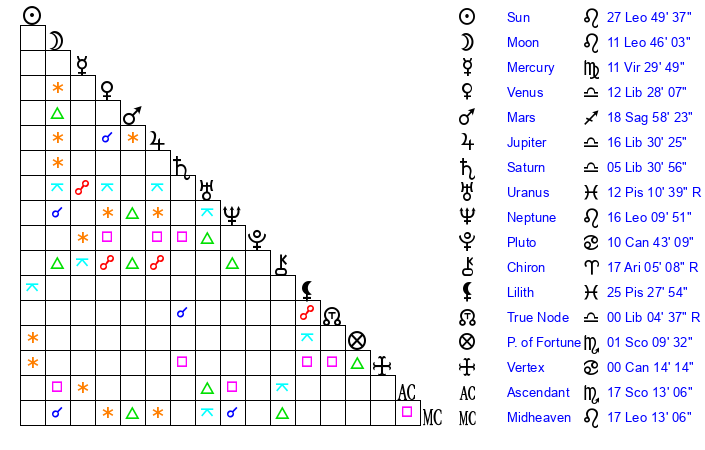 | Venus | 12 Libra 28 | 25 Cancer 16 | 27 Scorpio 55 |