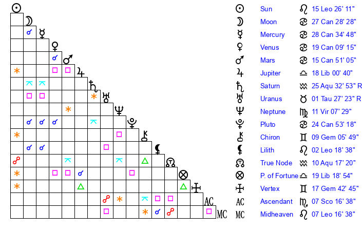 | Pluto | 24 Cancer 53 | 2 Aquarius 14 | 26 Cancer 2 |