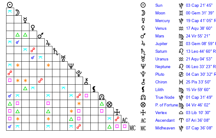 | Mercury | 19 Capricorn 40 | 12 Sagittarius 27 | 9 Taurus 8 |