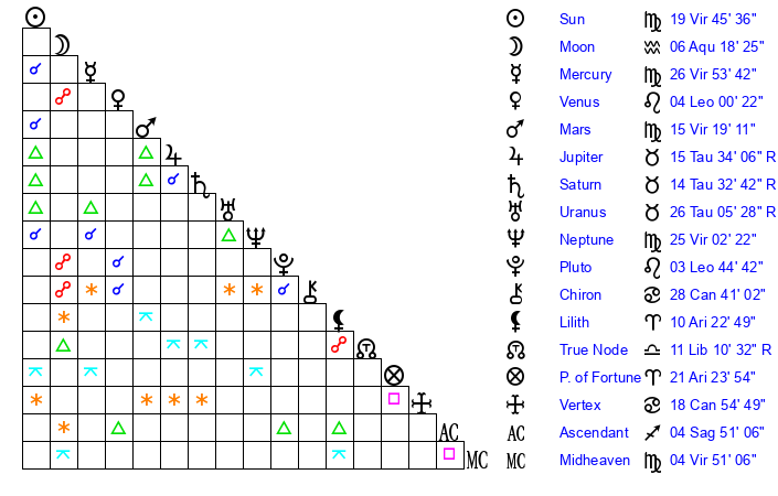 | Sun | 19 Virgo 45 | 20 Virgo 11 | 14 Sagittarius 27 |