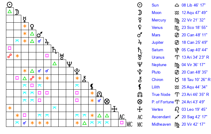 | Moon | 12 Aquarius 54 | 11 Aquarius 25 | 0 Leo 5 |