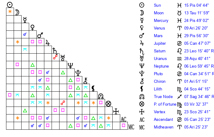 | Moon | 13 Taurus 7 | 16 Gemini 40 | 21 Pisces 29 |