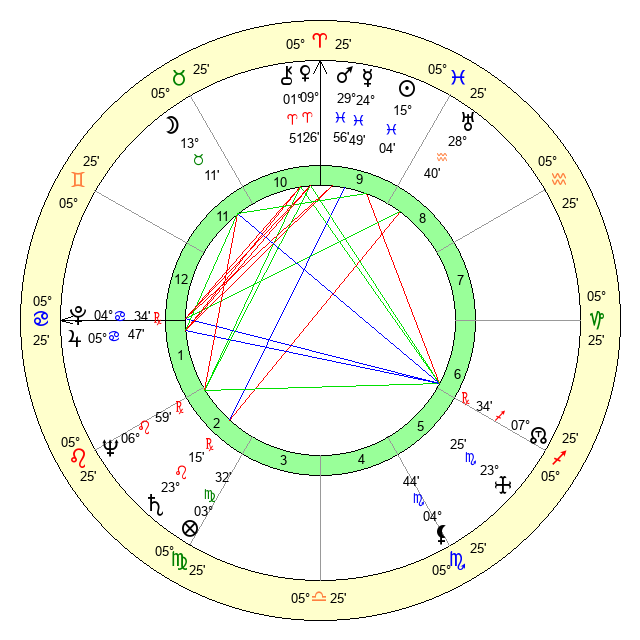 | Mars | 29 Pisces 56 | 17 Cancer 41 | 17 Gemini 43 |