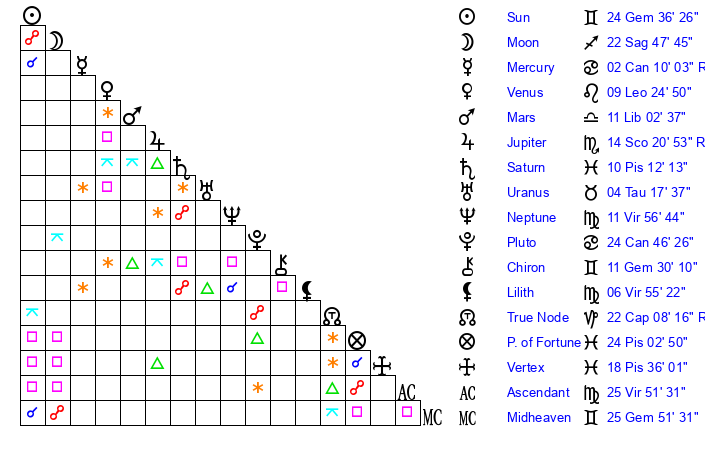| Sun | 24 Gemini 36 | 25 Gemini 48 | 20 Virgo 56 |