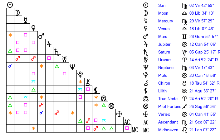 | Sun | 2 Virgo 43 | 3 Virgo 42 | 6 Sagittarius 46 |