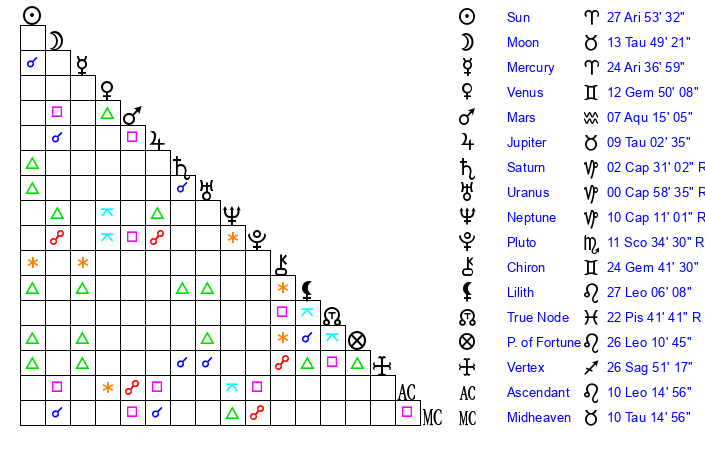 | Moon | 13 Taurus 51 | 19 Sagittarius 7 | 14 Virgo 36 |
