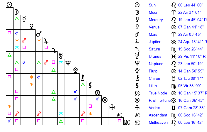 | Moon | 22 Aries 33 | 17 Libra 55 | 26 Scorpio 26 |