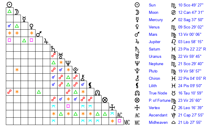 Neptune | 21 Scorpio 30 | 27 Pisces 26 | 23 Scorpio 32 |