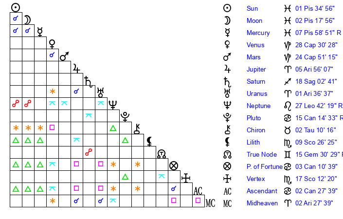 | Moon | 2 Pisces 16 | 10 Sagittarius 58 | 0 Libra 48 |