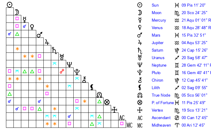 | Moon | 20 Scorpio 18 | 19 Pisces 32 | 15 Taurus 11 |