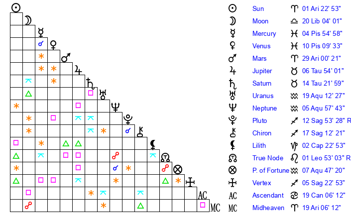 Sun | 1 Aries 23 | 1 Aries 20 | 26 Aries 2 |