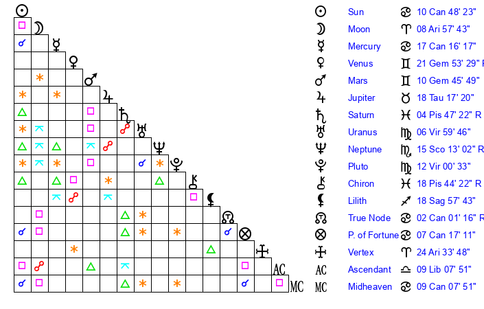 | Moon | 8 Aries 48 | 9 Libra 59 | 9 Cancer 53 |