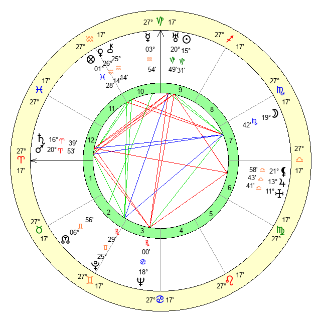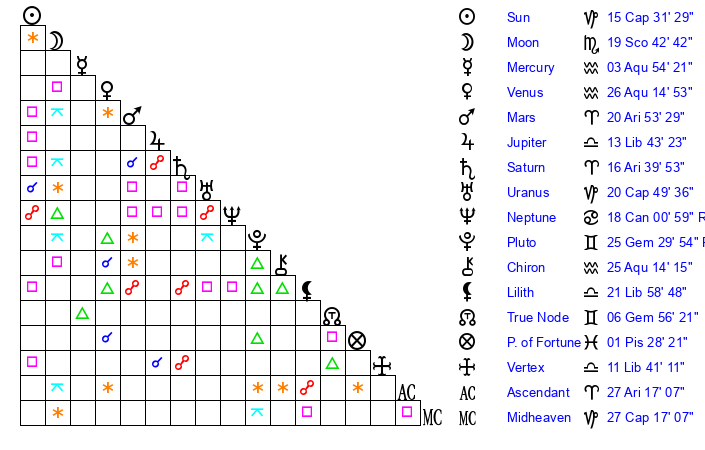 | Moon | 19 Scorpio 42 | 12 Aries 52 | 29 Capricorn 57 |
