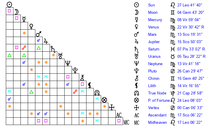 | Mercury | 8 Virgo 59 | 10 Leo 35 | 14 Scorpio 51 |