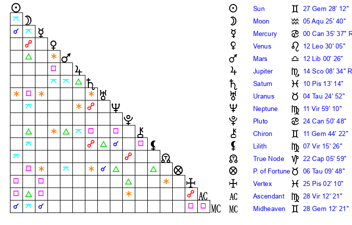 | Sun | 27 Gemini 28 | 28 Gemini 40 | 23 Virgo 52 |