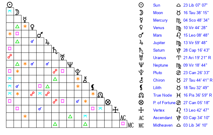 | Sun | 23 Libra 7 | 23 Libra 35 | 27 Capricorn 10 |