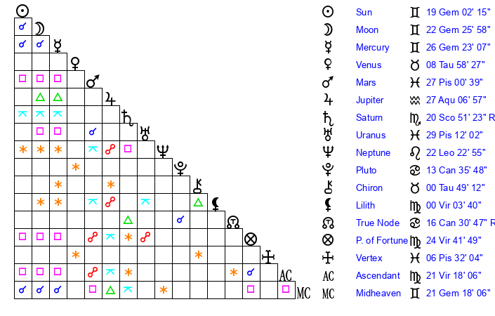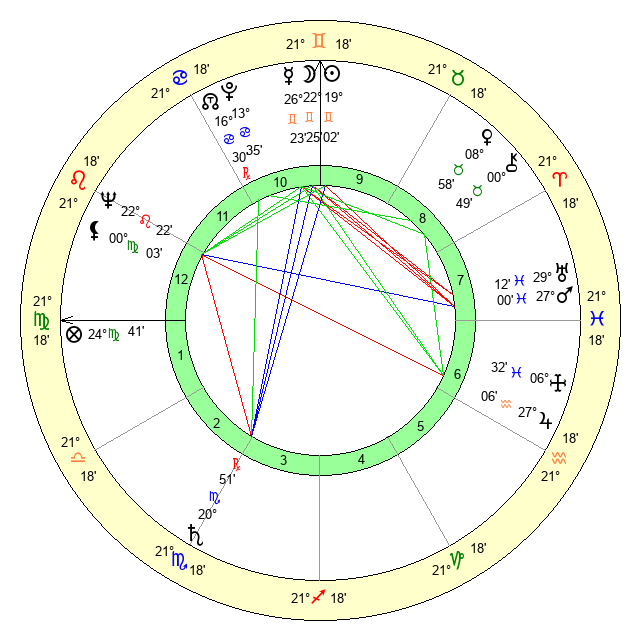 | Moon | 22 Gemini 17 | 13 Sagittarius 11 | 26 Capricorn 14 |