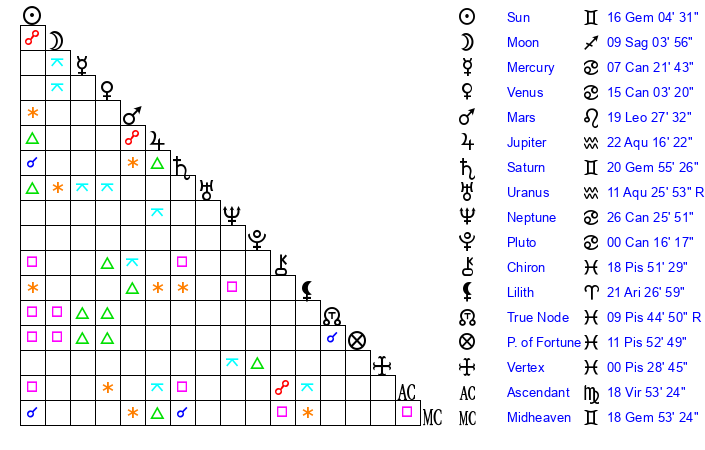 | Sun | 16 Gemini 4 | 17 Gemini 12 | 2 Libra 45 |