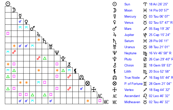 | Venus | 2 Taurus 57 | 25 Pisces 1 | 27 Taurus 47 |