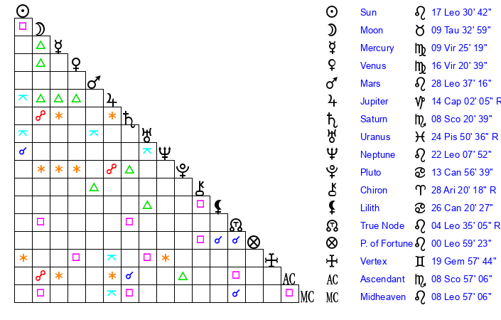 | Moon | 9 Taurus 42 | 5 Pisces 50 | 27 Sagittarius 38 |