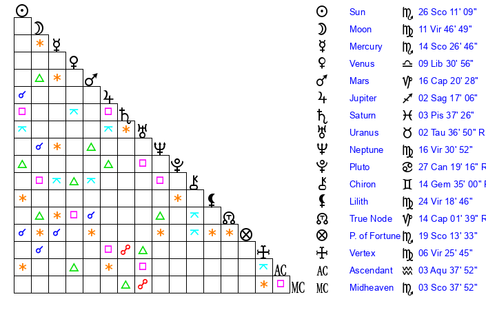 | Moon | 11 Virgo 47 | 18 Scorpio 23 | 18 Sagittarius 19 |