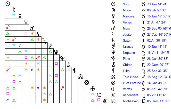 | Mercury | 15 Taurus 44 | 18 Taurus 52 | 20 Virgo 41 |