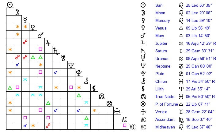 | Sun | 25 Leo 50 | 26 Leo 58 | 15 Sagittarius 47 |