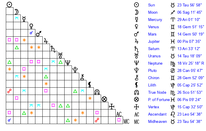 Sun | 23 Taurus 57 | 24 Taurus 52 | 17 Leo 8 |
