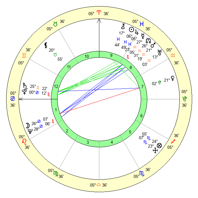 | Moon | 26 Cancer 6 | 17 Aquarius 33 | 5 Leo 36 |