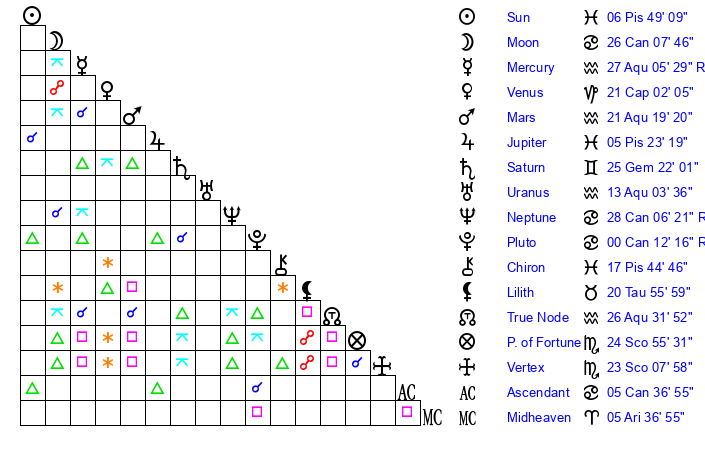 | Mercury | 27 Aquarius 4 | 22 Pisces 2 | 9 Cancer 9 |