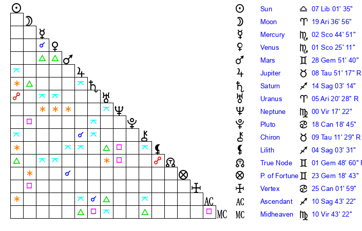 | Moon | 19 Aries 26 | 12 Capricorn 45 | 14 Scorpio 20 |