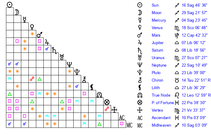 | Sun | 16 Sagittarius 46 | 16 Sagittarius 51 | 2 Aquarius 36 |