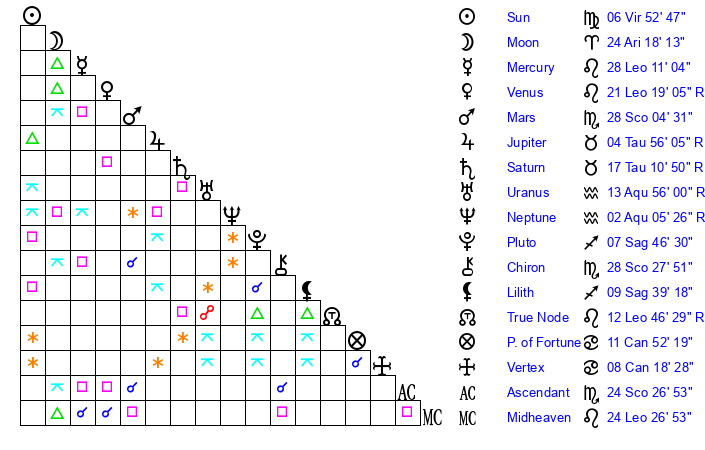 Mercury | 28 Leo 12 | 24 Leo 39 | 15 Libra 25 |