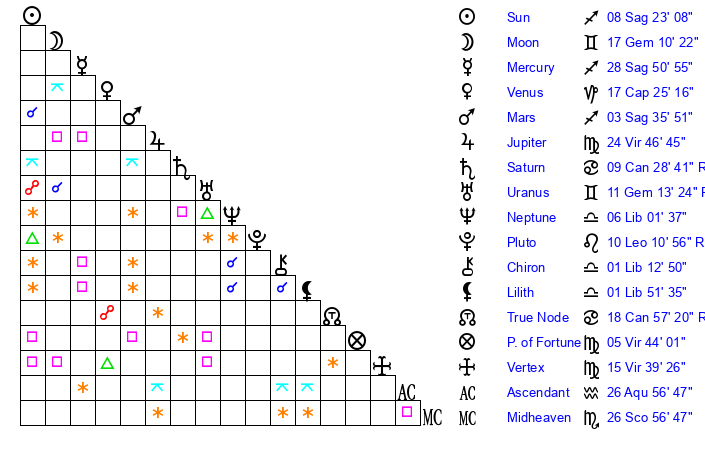 | Sun | 8 Sagittarius 23 | 8 Sagittarius 44 | 0 Pisces 42 |