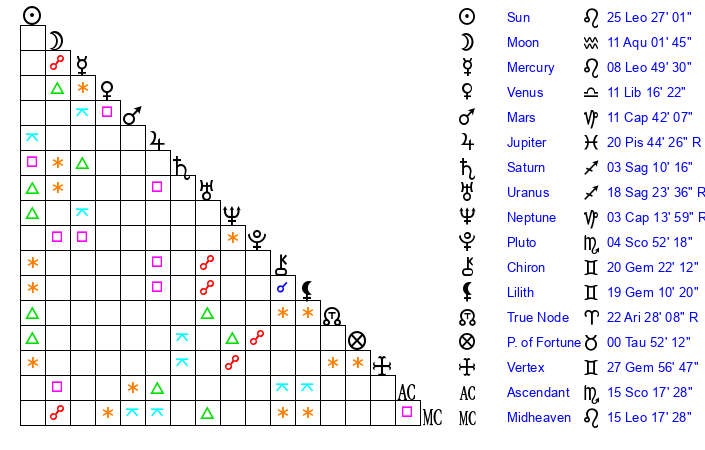 | Moon | 10 Aquarius 59 | 28 Gemini 39 | 9 Cancer 31 |