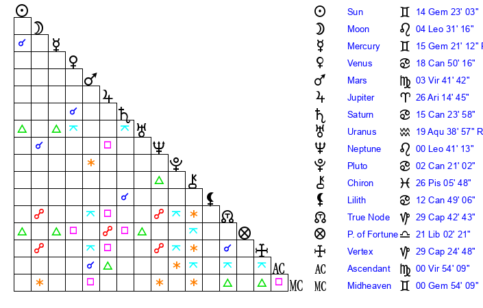 | Sun | 14 Gemini 24 | 15 Gemini 2 | 29 Virgo 4 |