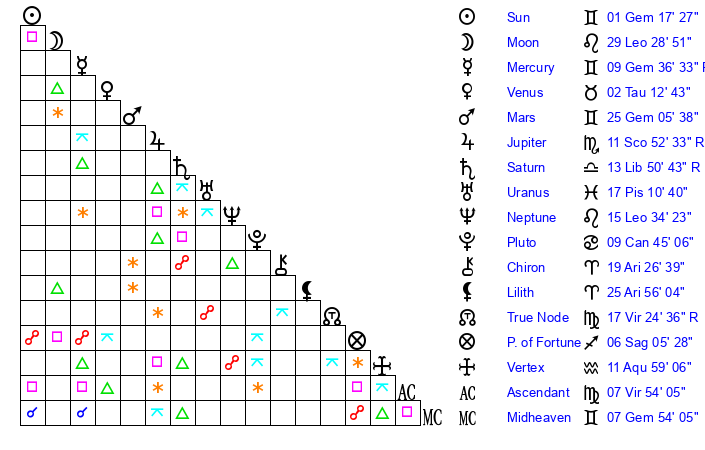 | Sun | 1 Gemini 17 | 2 Gemini 34 | 8 Virgo 57 |
