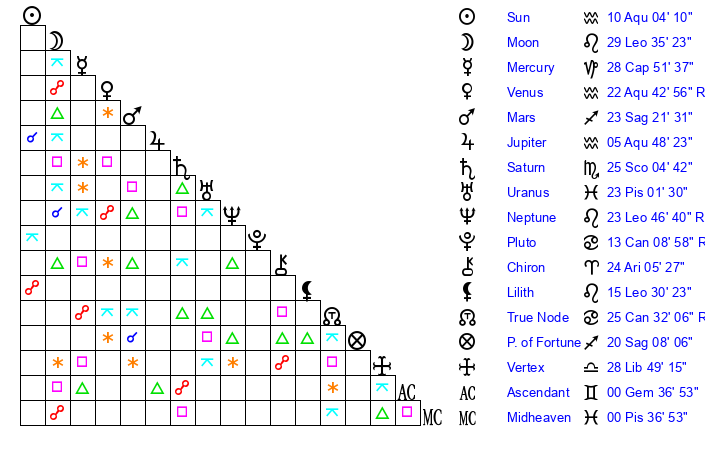 | Moon | 29 Leo 34 | 26 Aquarius 25 | 19 Aries 4 |