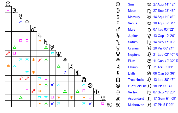 | Moon | 27 Scorpio 26 | 10 Libra 59 | 27 Cancer 59 |