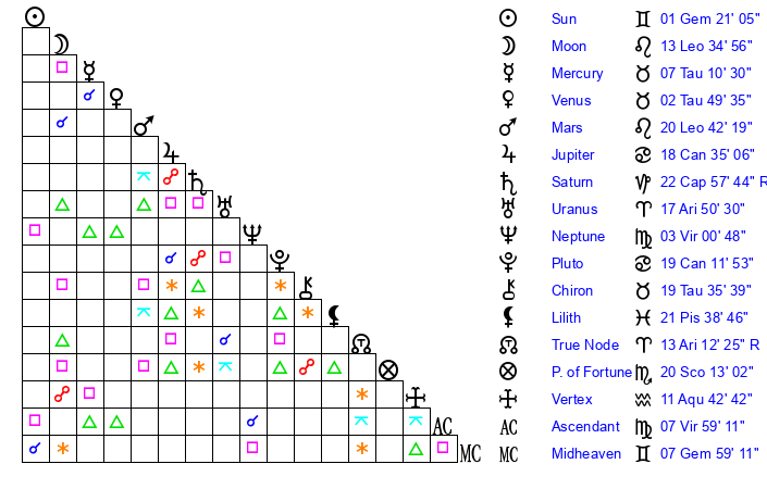 | Sun | 1 Gemini 21 | 2 Gemini 34 | 1 Virgo 16 |