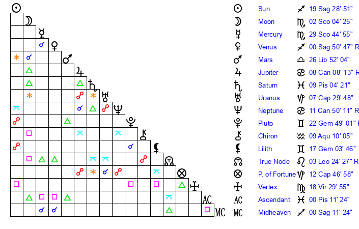 | Mercury | 29 Scorpio 45 | 7 Sagittarius 27 | 21 Pisces 43 |