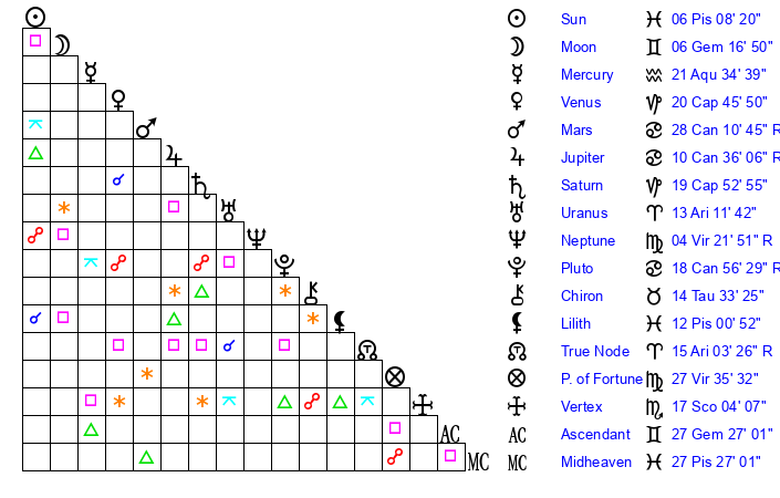 | Neptune | 4 Virgo 22 | 28 Pisces 46 | 3 Virgo 4 |